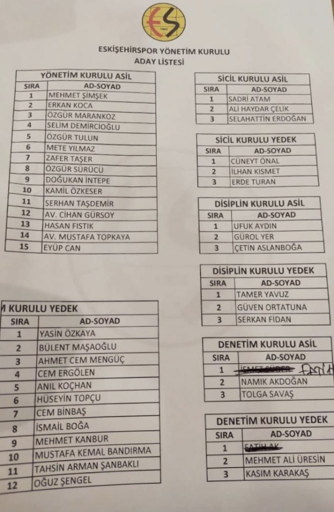 Mehmet Şimşek Başkanlığındaki listede Erkan Koca, Özgür Tulun, Mustafa Topkaya,Mete Yılmaz, Özgür Marangoz Selim Demercioğlu ,ZaferTaşel,Kamil Özkeser,Doğukan intepe, Serhan Taşdemir, Hasan Fıstık,Cihan Gürsoy Özgür Sürücü ve Eyüp Can yeraldı