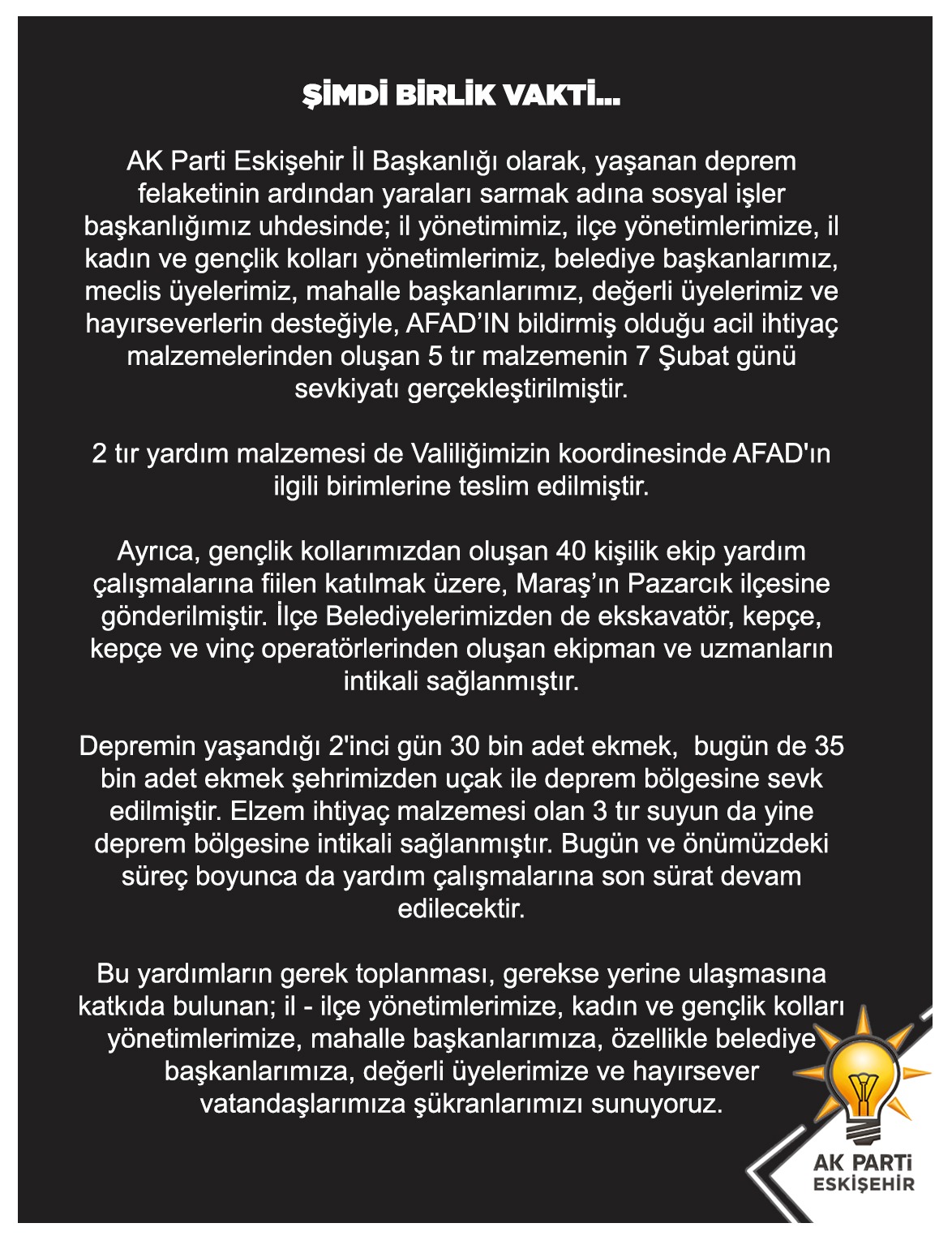 AK Parti Eskişehir İl Başkanlığı bu yardımların toplanması ve ulaştırılmasında Ana kademe ve İlçeler ile Kadın, Gençlik tüm Yönetim Kurulu üyelerinin, mahalle temsilcilerinin, Özellikle Belediye Başkanlarının, hayırseverlere şükranlarını iletildiği belirtildi
