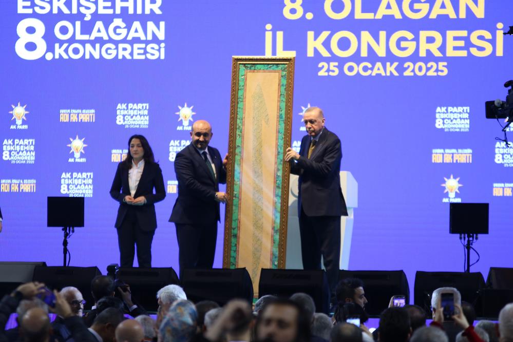 AK Parti Eskişehir İl Başkanı Gürhan Albayrak, Cumhurbaşkanı Recep Tayyip Erdoğan’a konuşmasının ardından üzerinde 'Elif' harfi olan tabloyu hediye etti.