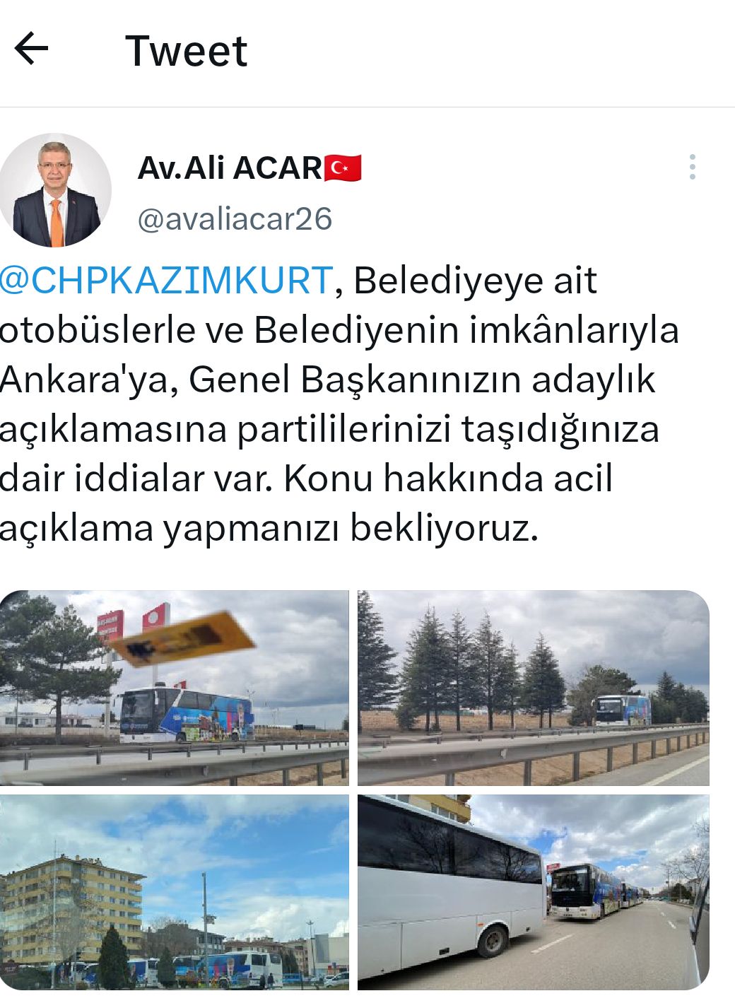 AK Parti İlçe Başkanı Acar;Belediyeye ait otobüslerle ve Belediyenin imkânlarıyla Ankara'ya, Genel Başkanınızın adaylık açıklamasına partililerinizi taşıdığınıza dair iddialar var. Konu hakkında acil açıklama yapmanızı bekliyoruz dedi