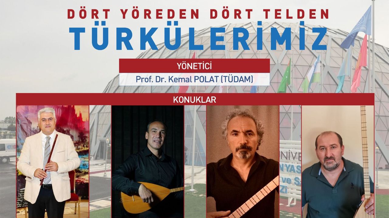 Anadolu Üniversitesi Türk Dünyası Uygulama ve Araştırma Merkezi (TÜDAM), her ay düzenlediği “İlgiden Duyguya, Duygudan Ruha Türk Dünyası Kültür Sanat Etkinlikleri” kapsamında “Dört Yöreden Dört Telden Türkülerimiz” adlı Söyleşi ve canlı Dinleti programı düzenleyecek.Yöneticiliğini TÜDAM Müdürü Prof. Dr. Kemal Polat’ın yapacağı Program, 26.06. 2021 Cumartesi (Bugün) saat: 21:00’de çevrimiçi olarak gerçekleşecek.