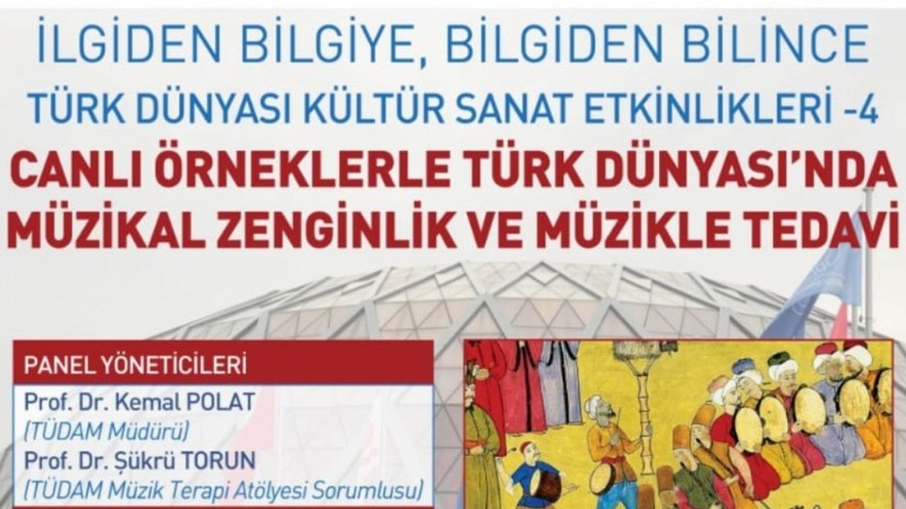 Anadolu Üniversitesi Türk Dünyası Uygulama ve Araştırma Merkezi (TÜDAM) tarafından “İlgiden Bilgiye, Bilgiden Bilince” etkinlikleri kapsamında 29 Mayıs Cumartesi günü saat 20.00’de “Canlı Örneklerle Türk Dünyası'nda Müzikal Zenginlik ve Müzikle Tedavi” adlı çevrim içi panel gerçekleştirilecek.