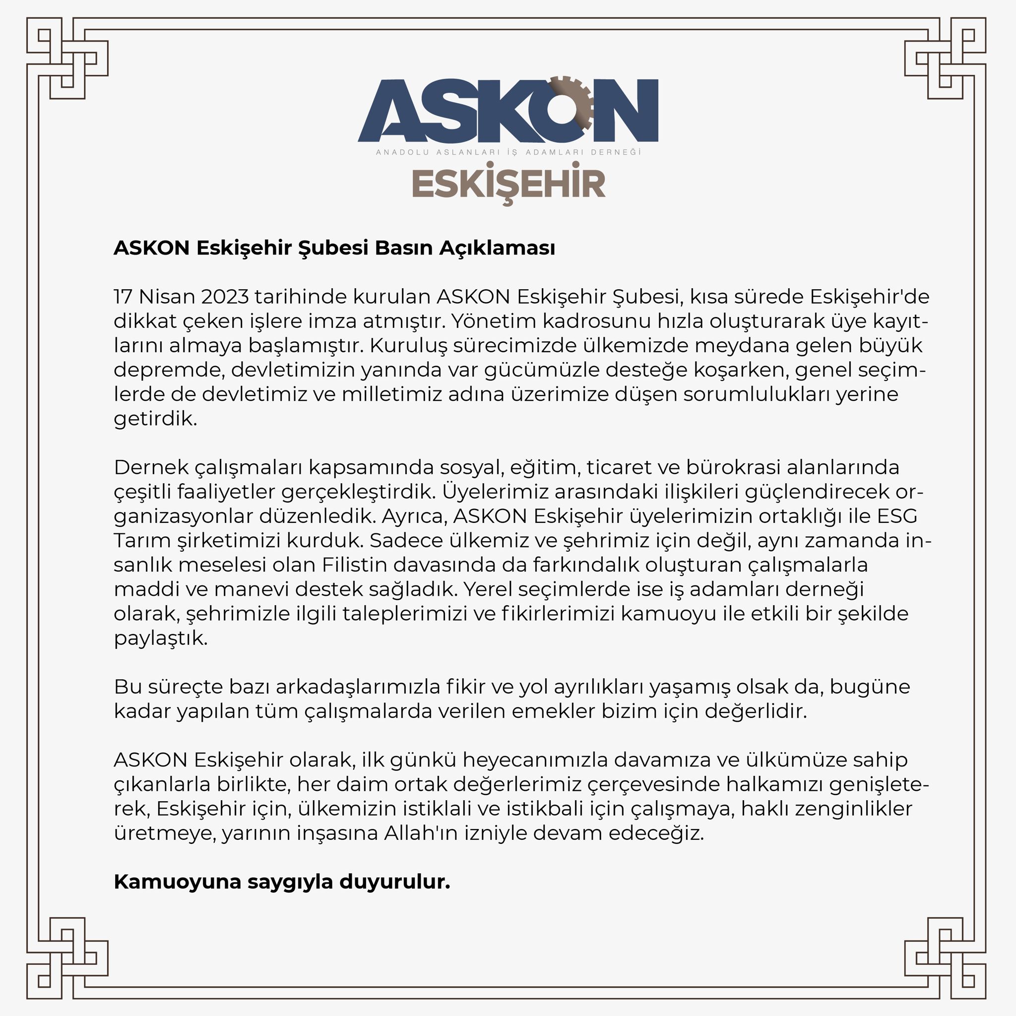 ASKON Eskişehir şubesi yaptıgı yazılı açıklamada; 17 Nisan 2023 tarihinde kurulan ASKON Eskişehir Şubesi, kısa sürede Eskişehir'de dikkat çeken işlere imza atmıştır. Yönetim kadrosunu hızla oluşturarak üye kayıtlarını almaya başlamıştır. Kuruluş sürecimizde ülkemizde meydana gelen büyük depremde, devletimizin yanında var gücümüzle desteğe koşarken, genel seçimlerde de devletimiz ve milletimiz adına üzerimize düşen sorumlulukları yerine getirdik denildi.