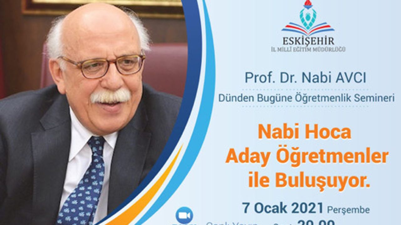 Eskişehir İl Millî Eğitim Müdürlüğü’nün düzenlediği programda Prof. Dr. Nabi Avcı, görüntülü haberleşme uygulaması Zoom üzerinden aday öğretmenler ile buluşacak ve ‘Dünden Bugüne Öğretmenlik’ isimli bir seminer verecek.