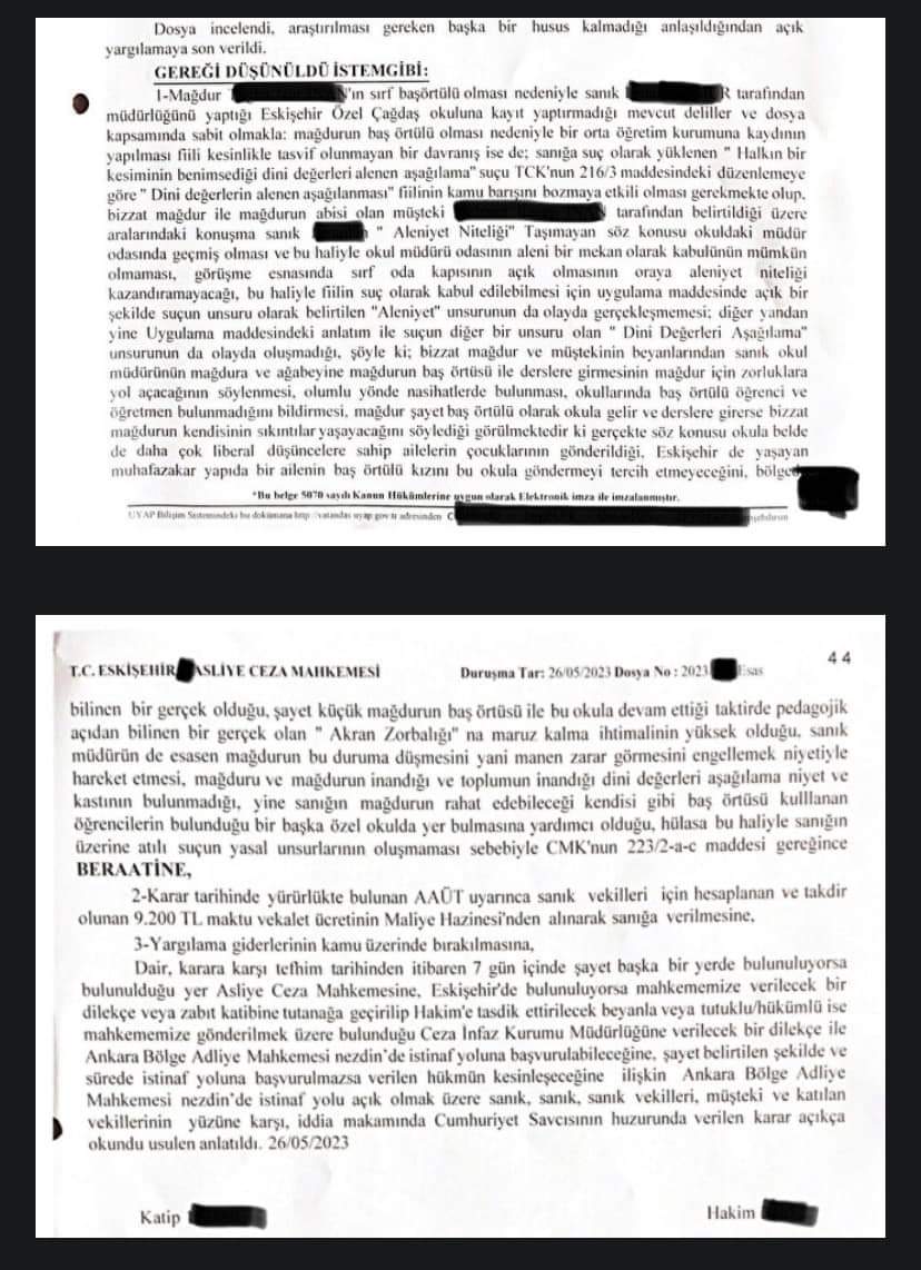Eskişehir’de başörtülü olduğu gerekçesiyle depremzede kız çocuğunu okula almayan müdür İsmail Samur hakkında hakim kendi ile çelişerek beraat kararı verdi. Çocuğun ‘sırf’ başörtülü olduğu için okula alınmadığını kabul eden hakim, müdürün toplumsal alanda değil birebir diyalog halindeyken kız çocuğuna ‘nasihat’ verdiğini 'olumlayarak' ileri sürdü. Savcının ise deliller yönünde müdürün cezalandırılmasını talep etmesine rağmen, müdür Samur’un verilecek karardan önceden haberi varmışçasına mütalaadan sonra yazılı savunma için süre talep etmemesi dikkat çekti.Âsrın felaketi 6 Şubat depremlerinin ardından Hatay’dan Eskişehir’e gelen depremzede aile, kız çocuğunu kaldıkları evin yakınında bulunan Özel Çağdaş Okulu’na kaydettirmek istediklerinde 28 Şubat zihniyetine sahip bir müdür ile karşı karşıya kaldı. Başörtülü olduğu için okula alınmayan 9. sınıf öğrencisi T.İ. henüz depremin psikolojik etkilerini atlatamamışken okul yönetiminin tavrı ile ikinci şoku yaşadı.Yaşanan olayın kamuoyunda büyük yankı bulmasının ardından öğrenciyi başörtüsü nedeniyle okula kaydetmeyen müdür İsmail Samur hakkında "halkın bir kesiminin benimsediği dini değerleri alenen aşağılama" suçundan 1 yıla kadar hapis cezası istemiyle iddianame hazırlandı.Hakimden ayrıştırıcı karar
