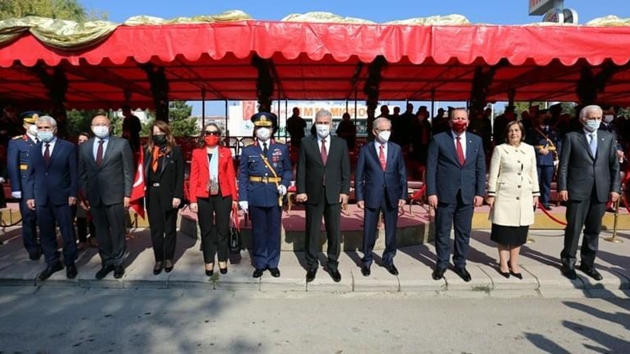 Atatürk Bulvarı’ndaki tören ilk olarak Vali Ayyıldız, Muharip Hava Kuvveti Komutanı Hava Orgeneral Gülan ve Büyükşehir Belediye Başkanı Büyükerşen’in askeri araçla halkı selamlamasıyla başladı. Ardından saygı duruşu ve İstiklal Marşımız hep bir ağızdan okundu.