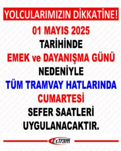 Eskişehir Hafif Raylı Sistem İşletmesi (EsTram) tarafından yapılan açıklamaya göre, 1 Mayıs 2025 Perşembe günü, Emek ve Dayanışma Günü dolayısıyla tüm tramvay hatlarında seferler "Cumartesi tarifesi"ne göre gerçekleştirilecektir denildi.