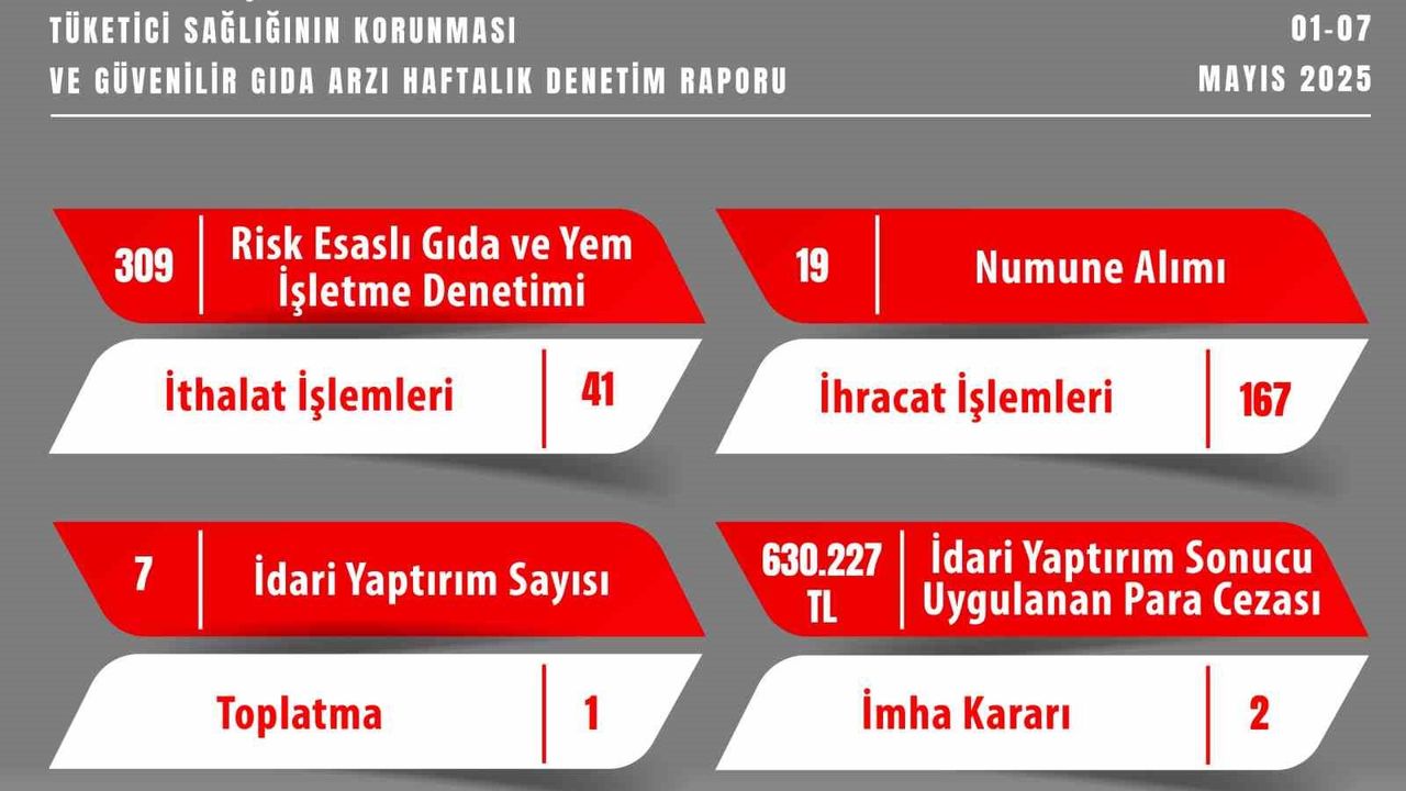 İl Tarım ve Orman Müdürlüğü Gıda ve Yem Şube Müdürlüğü’nün tüketici sağlığının korunması ve güvenilir gıda arzı amacıyla gerçekleştirdiği denetimler sürüyor. Bu çerçevede, 1-7 Mayıs tarihleri arasında yapılan çalışmalarla ilgili rapor Eskişehir Valiliği tarafından paylaşıldı. Yayımlanan bilgilere göre; 309 risk esaslı gıda ve yem işletme denetimi, 19 numune alımı, 41 ithalat ve 167 ihracat işlemleri gerçekleştirildi. Yapılan çalışmalar sonucunda; 7 idari yaptırım, 1 toplatma ve 2 imha kararı verildi, toplam 630 bin 227 TL para cezası uygulandı. Ayrıca, 2 kamuoyu duyurusu yapıldığı belirtildi.