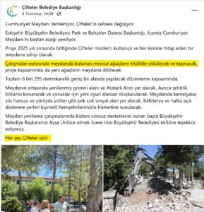 “4 Temmuz 2025 tarihinde Çifteler Belediyesi sosyal medya hesabından yapılan bir paylaşıma baktığınızda meydan düzenlemesi altında mevcut ağaçların “titizlikle söküleceği” ve taşınacağı yazıyor. Lakin bu ifadelerin yalnızca sözde kaldığını üzülerek ifade etmek istiyoruz. Sahadaki manzara çok farklı. Ağaçlar birer birer kesiliyor. Yıllardır orada kök salmış, gölge vermiş ağaçlar iş makineleriyle acımasızca katlediliyor.