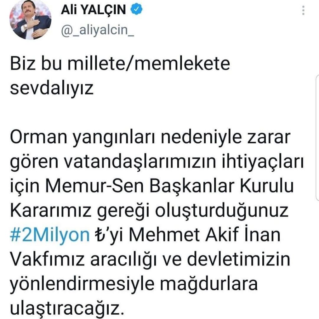 Zor zamanlarında daima devletimizin ve milletimizin yanında olmayı kendine vazife gören Türkiye'nin en büyük sivil toplum örgütü Memur-Sen yangın felaketlerinde zarar gören vatandaşlarımızın yaralarını sarmak için Mehmet Akif İnan Vakfı aracılığı ve devletimizin yönlendirmesiyle 2 Milyon TL'yi mağdur olan vatandaşlarımıza ulaştıracaktır.”