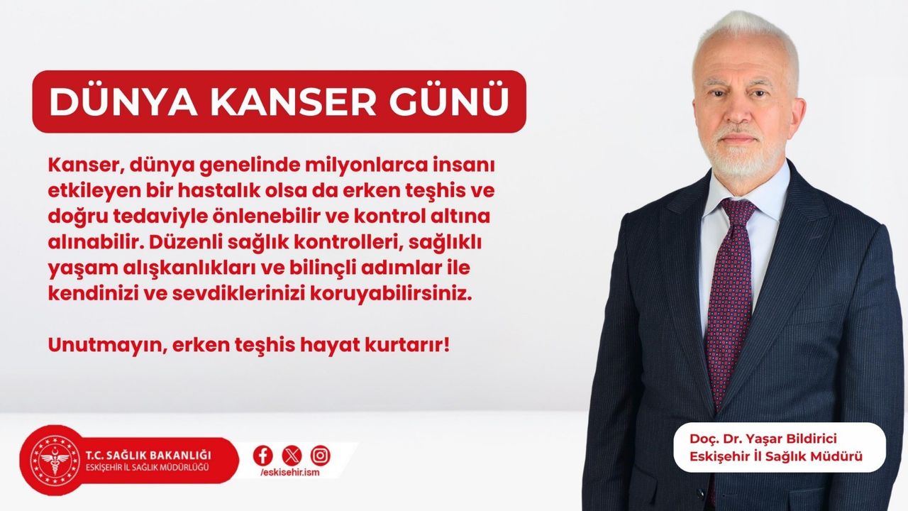 Eskişehir İl Sağlık Müdürü Doç. Dr. Yaşar Bildirici, 4 Şubat Dünya Kanser Günü dolasıyla açıklama yaptı. Bildirici, Dünya Kanser Günü'nün Uluslararası Kanser Kontrol Örgütü (UICC) tarafından ilk kez 2005 yılında düzenlendiğini ve bu etkinliklerin her yıl 4 Şubat tarihinde dünyanın dört bir yanında gerçekleştirildiğini ifade etti.