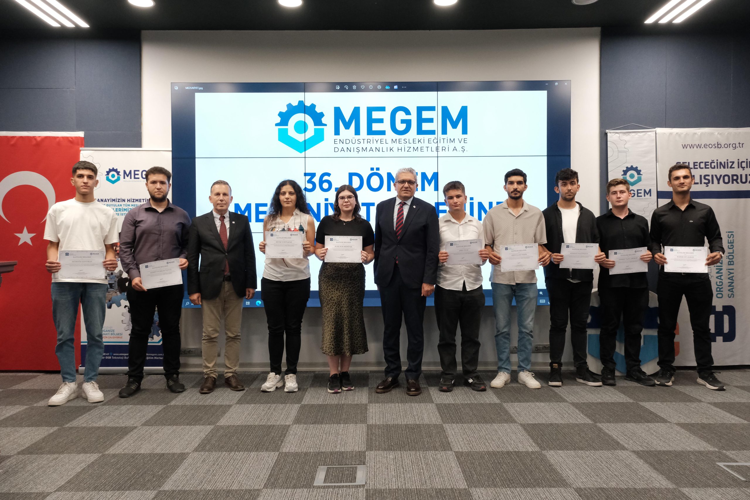 Eskişehir OSB Konferans Salonunda gerçekleşen mezuniyet törenine Eskişehir OSB Yönetim Kurulu Başkanı Nadir Küpeli, Eskişehir OSB ve MEGEM Yönetim Kurulu Üyesi Yavuz Ayva, BEBKA Eskişehir Koordinatörü Güliz Ünal, MEGEM Yönetim Kurulu Üyesi Pınar Barış, MEGEM Genel Müdür Vekili Mustafa Özenç katıldı.