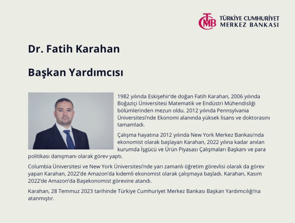 Merkez Bankası Başkanlıgına atanan;Fatih Karahan, 2006 yılında Boğaziçi Üniversitesi Endüstri Mühendisliği ve Matematik bölümlerinden mezun oldu. Pensilvanya Üniversitesi’nde ekonomi üzerine yüksek lisans ve doktorasını tamamladı. Çalışma ekonomisi ve mikroekonomi üzerine çalışan Karahan, 2012 yılından beri New York Merkez Bankası’na bağlı Para Politikası Araştırma Birimi bünyesindeki İşgücü ve Ürün Piyasası Çalışmalarında ekonomist olarak yer alıyordu.