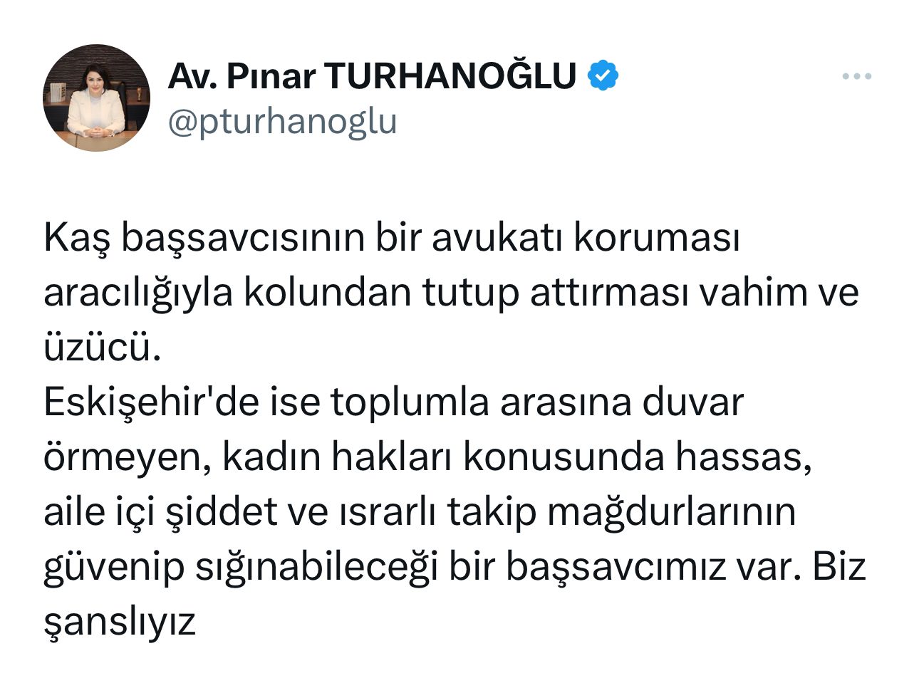 Av Pınar Turhanoglu Gücüyener; Kaş başsavcısının bir avukatı koruması aracılığıyla kolundan tutup attırması vahim ve üzücü.