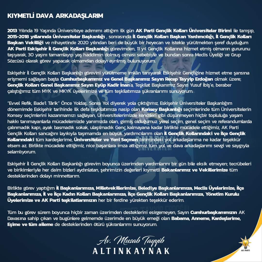 Musab Tayyib Altınkaynak; 2013 Yılında 19 Yaşında Üniversiteye adımımı attığım ilk gün AK Parti Gençlik Kolları Üniversiteler Birimi ile tanışıp, 2015-2018 yıllarında Üniversiteler Başkanlığı , sonrasında İl Gençlik Kolları Başkan Yardımcılığı, İl Gençlik Kolları Başkan Vekilliği ve nihayetinde 2020 yılından beri de büyük bir heyecan ve istekle yürütmekten şeref duyduğum AK Parti Eskişehir İl Gençlik Kolları Başkanlığı görevimden, 11 yıl Gençlik Kollarına hizmet etmiş olmanın gururunu taşıyarak, 30 yaşını tamamlayıp yaş haddimin dolmuş olması sebebiyle ve bundan sonra Meclis Üyeliği ve Grup Sözcüsü olarak görev yapacak olmamdan dolayı ayrılmış bulunuyorum.