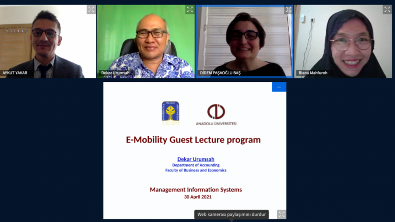 Ayrıca, ikili iş birliği protokolleri kapsamında ise UniversitasIslam Indonesia’dan dört öğretim üyesi İşletme Bölümü tarafından misafir edildi. Dr. Hendi Yogi Prabowo, Prof. Dr. Seval Selimoğlu’nun Auditing dersinde; Dr. Dekar Urumsahise Doç. Dr. Didem Paşaoğlu Baş’ın Management Information Systems dersinde öğrencilerle bir araya geldi. Bununla birlikte, Universitas Islam Indonesia’dan misafir edilen diğer öğretim üyeleri Dr. Ayu Chairaina Laksmi ve Riana Mahfurohise Anadolu Üniversitesi’nde kullanılan Mergen sistemini tanımak amacıyla derslere gözlemci olarak katıldı. Bu kapsamda uluslararası çevrim içi ders verecek öğretim üyelerine rehber olması amacıyla, Arş. Gör. Aylin Koca, Arş. Gör. Ali Benli ve Arş. Gör. Aykut Yakar tarafından hazırlanan Mergen kullanım kılavuzu, İşletme Bölümü Erasmus+ Koordinatörlüğü tarafından İngilizceye tercüme edildi.