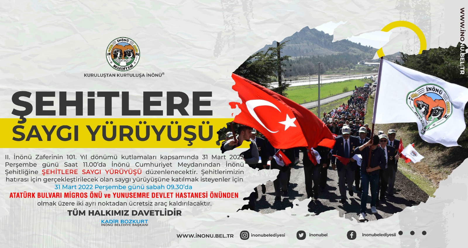 31 Mart 2022 Perşembe günü saat 11.00'de İnönü Cumhuriyet Meydanı'ndan başlayacak olan yürüyüş İnönü Şehitliğine kadar devam edecek ve burada şehitlerimiz anılacak.