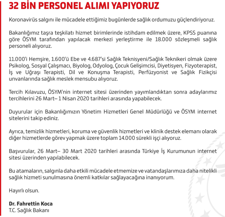Yayımlanan duyuruda temizlik personeli, güvenlik, klinik destek elemanı ve diğer kadrolara 14 bin işçi alınacağına yer verildi.