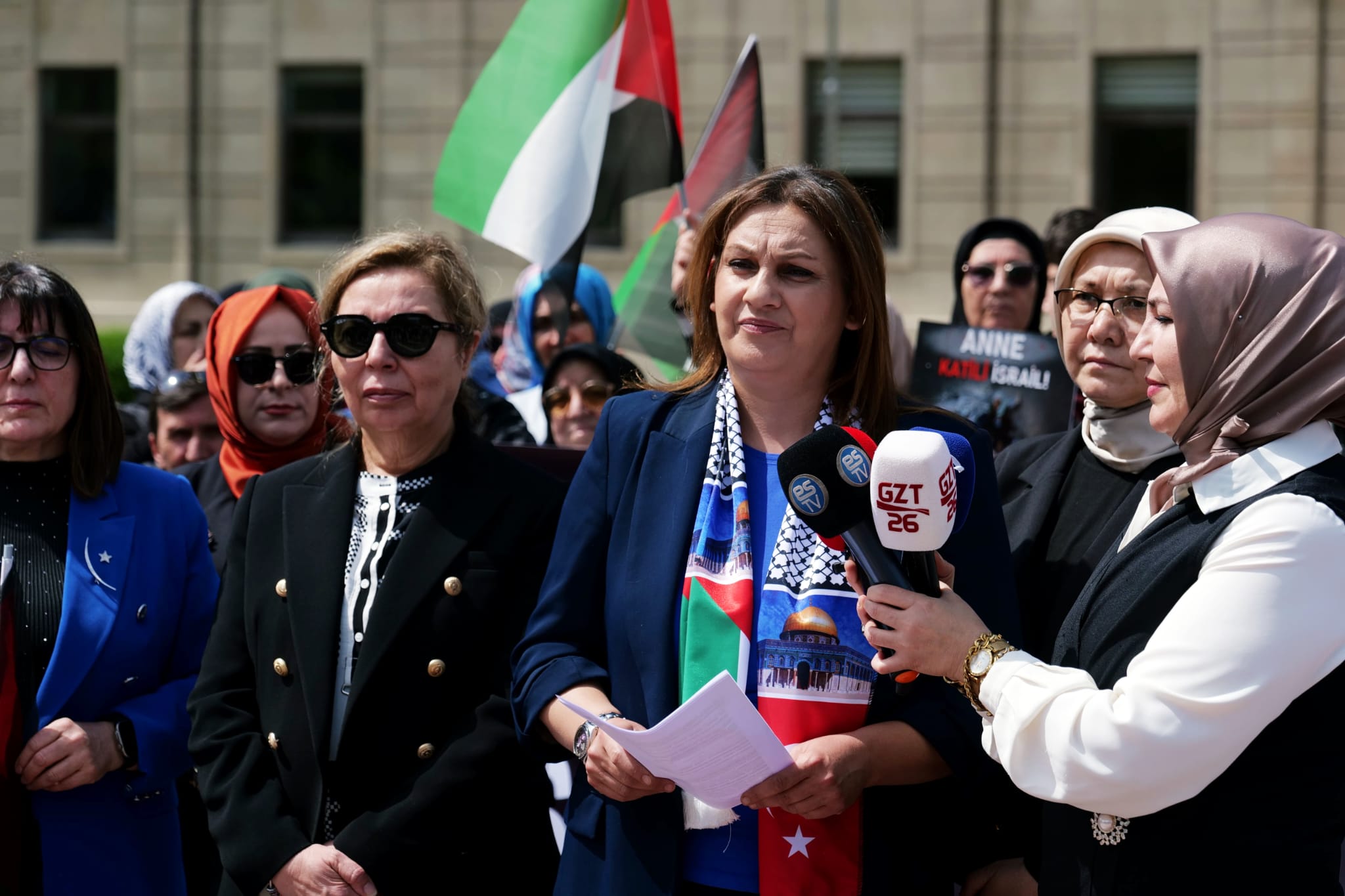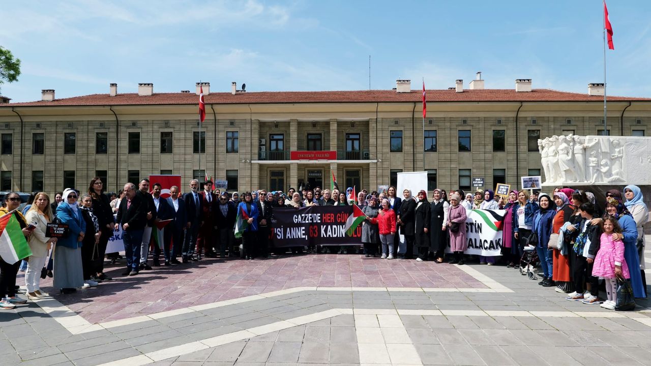 Bizler bugün AK Parti Eskişehir İl Kadın Kolları Başkanlığı, teşkilatlarımız, kadın milletvekilleri, sivil toplum kuruluşu temsilcileri olarak buradayız. Şu anda 81 ilde AK partili kadınlar olarak Gazzeli anneler için dimdik ayaktayız.