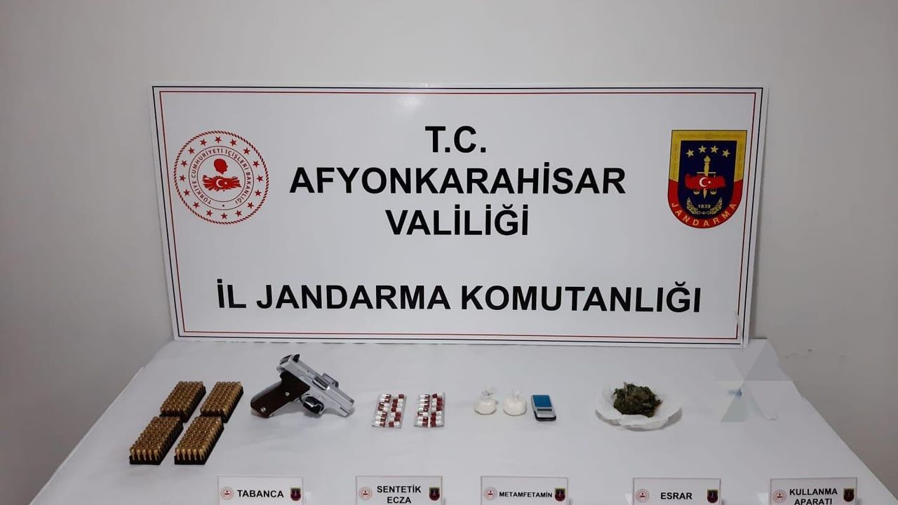 Afyonkarahisar İl Jandarma Komutanlığı ekipleri uyuşturucu ile mücadelesini sürdürüyor. Bu çerçevede ekipler, H.İ.Y. isimli şahsın, Çayırbağ beldesinde uyuşturucu madde satarak haksız kazanç sağlayacağı yönünde bilgi elde etti. Bunun üzerine harekete geçen ekipler, şüphelinin kullandığı aracı durdurdu. Şüphelinin üzerinde, araçta ve ikametinde yapılan arama sonucunda; 42,26 gram metamfetamin, 28 adet lyrica sentetik uyuşturucu hap, 19,52 gram kubar esrar, 1 adet dijital hassas cep terazisi, 1 adet ruhsatsız tabanca, 210 adet tabanca fişeği, 2 adet uyuşturucu madde kullanma aparatı, 1 adet cep telefonu ele geçirildi.