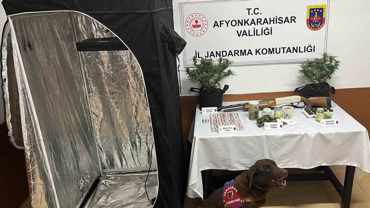 Afyonkarahisar’da jandarma ekipleri baskın yaptıkları adreste uyuşturucu yetiştirmek için kurulan iklimlendirme cihazı ile birlikte değişik tür ve miktarlarda uyuşturucu madde ele geçirdi.