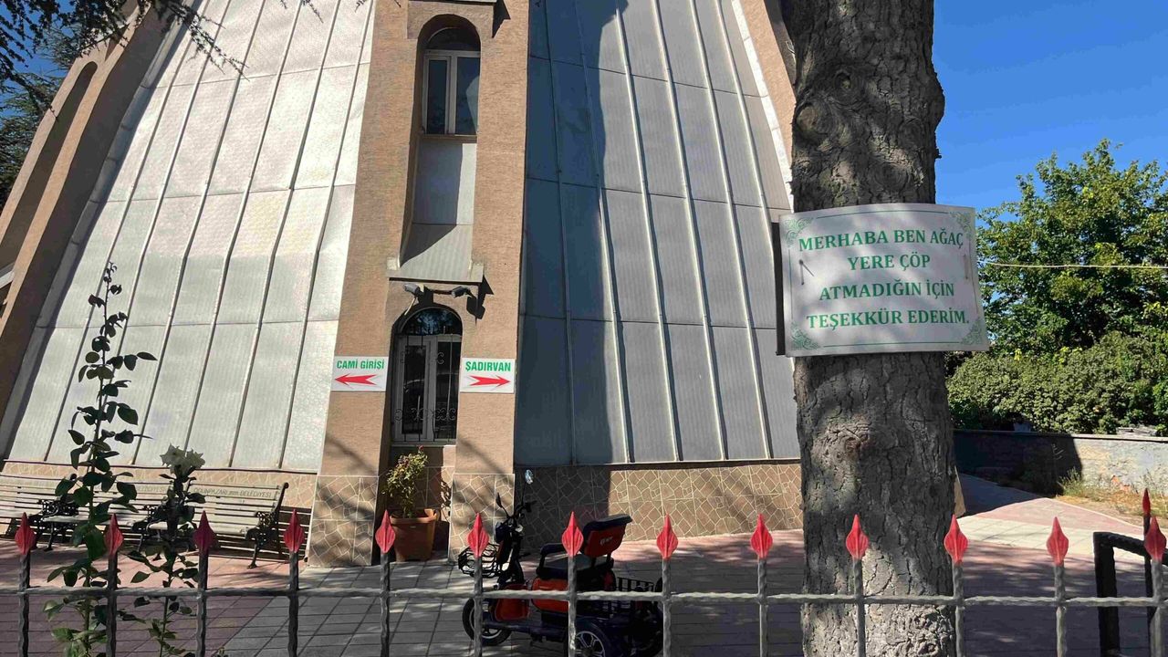 Eskişehir'deki bir cami bahçesindeki ağaçlara asılan yazılı tabelalar, çevre temizliği konusunda farkındalık oluşturuyor.