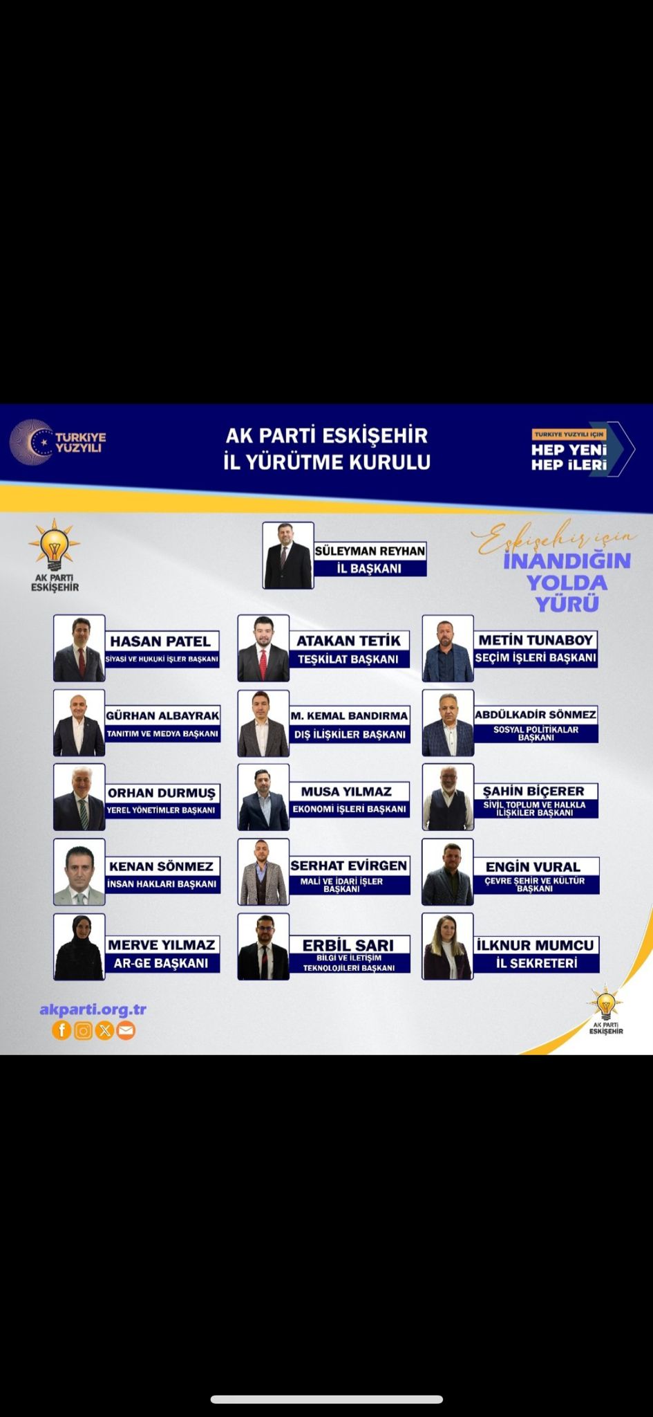 Hasan Patel'in Parti’nin ikinci ismi olan Siyasi ve Hukuk işleri Başkanı olmasının ardından, Teşkilat Başkanı Kırım camiasının önde gelen isimlerinden ve Merkez sag siyasetinin sembol isimlerinden Yetkin Tetik'in oğlu Atakan Tetik,Teşkilat Başkanı ,Balkan Göçmenleri Dernekleri ve Rumeli Derneklerinin etkin ismi Metin Tunaboy seçim işleri Başkanı, ESO Meclis üyesi Gürhan Albayrak Tanıtım ve Medya Başkanı, ESİAD Yönetim kurulu ve Türk Ocagı üyesi Aydın Bandırma'da oğlu ve geçen dönemin Alpu Belediye Başkan Aday Adayı Mustafa Kemal Bandırma Dış ilişkiler Başkanı, Mermerciler Derneği Başkanı ve şehrimizde yaşayan Afyonluların renkli ismi Bolvadinliler Darnek Yöneticisi Abdülkadir Sönmez Sosyal Politikalar Başkanı,2004 yılından bu yana Belediye Meclis üyeligi görevlerinde bulunan Orhan Durmuş Yerel Yönetimler Başkanı olurken,Büyükşehir Belediye Başkan Adayı Nebi Hatipoğlu'nun yakın çalışma ekibinden Musa Yılmaz'dan Ekonomik İşler Başkanı oldu.Uzun yıllar Yönetimlerde yeralan Şahin Biçerer'de Sivil toplum ve Halkla ilişkiler Başkanı oldu.