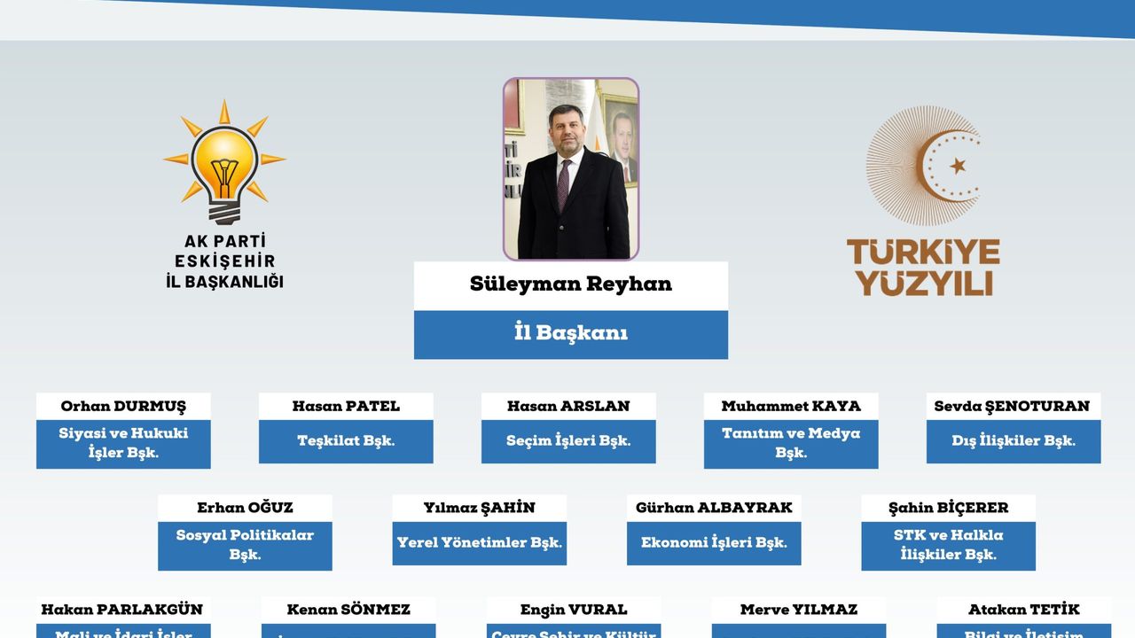 AK Parti İl Başkanı Başkanı Süleyman Reyhan , görev yapacak olan İl Yürütme Kurulumuz, partimize ve Eskişehir'imize hayırlı olsun. Dedi
