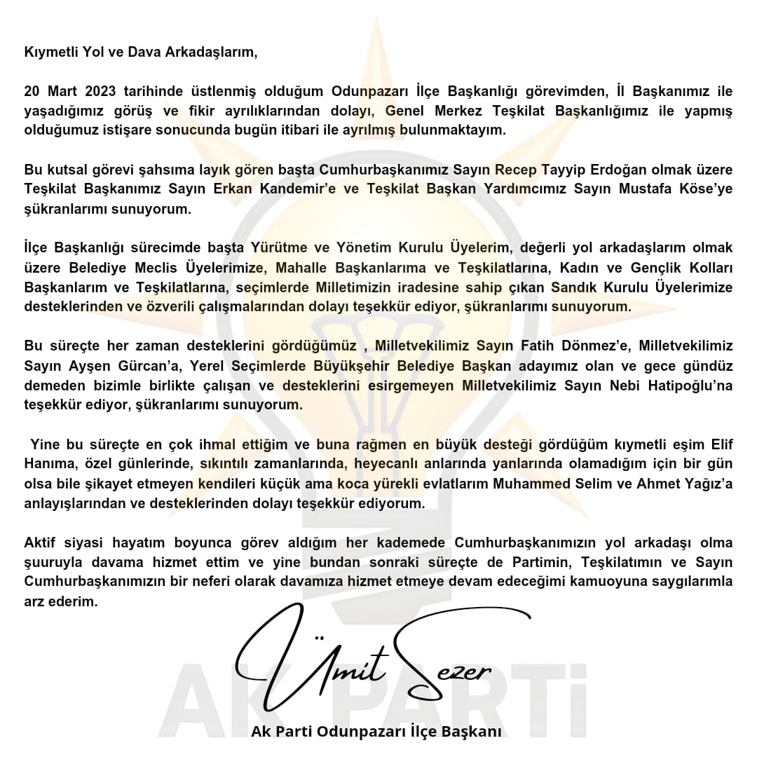 20 Mart 2023 tarihinde üstlenmiş olduğum Odunpazarı İlçe Başkanlığı görevimden, İl Başkanımız ile yaşadığımız görüş ve fikir ayrılıklarından dolayı, Genel Merkez Teşkilat Başkanlığımız ile yapmış olduğumuz istişare sonucunda bugün itibari ile ayrılmış bulunmaktayım.