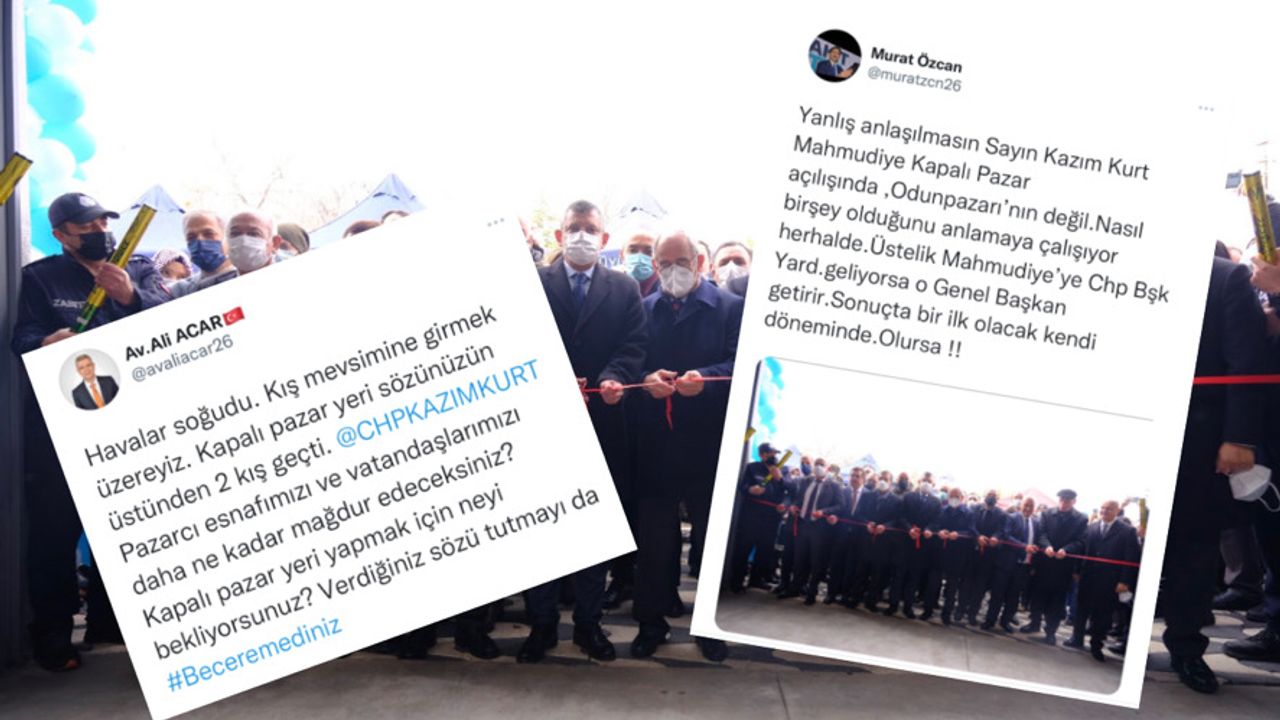 Mahmudiye Belediyesi’nin dün açılışını yaptığı ve başta CHP Grup Başkanvekili Manisa Milletvekili Özgür Özel olmak üzere tüm CHP’li belediye başkanlarının katıldığı kapalı pazar yeri açılışı sonrası, AK Parti Eskişehir Büyükşehir Belediyesi ve Odunpazarı Belediyesi Meclisi Grup Başkan Vekili Murat Özcan ve AK Parti Odunpazarı İlçe Başkanı Ali Acar tarafından Odunpazarı Belediye Başkanı Kazım Kurt’a kendi ilçesinde verdiği kapalı pazar yeri sözü hatırlatıldı.