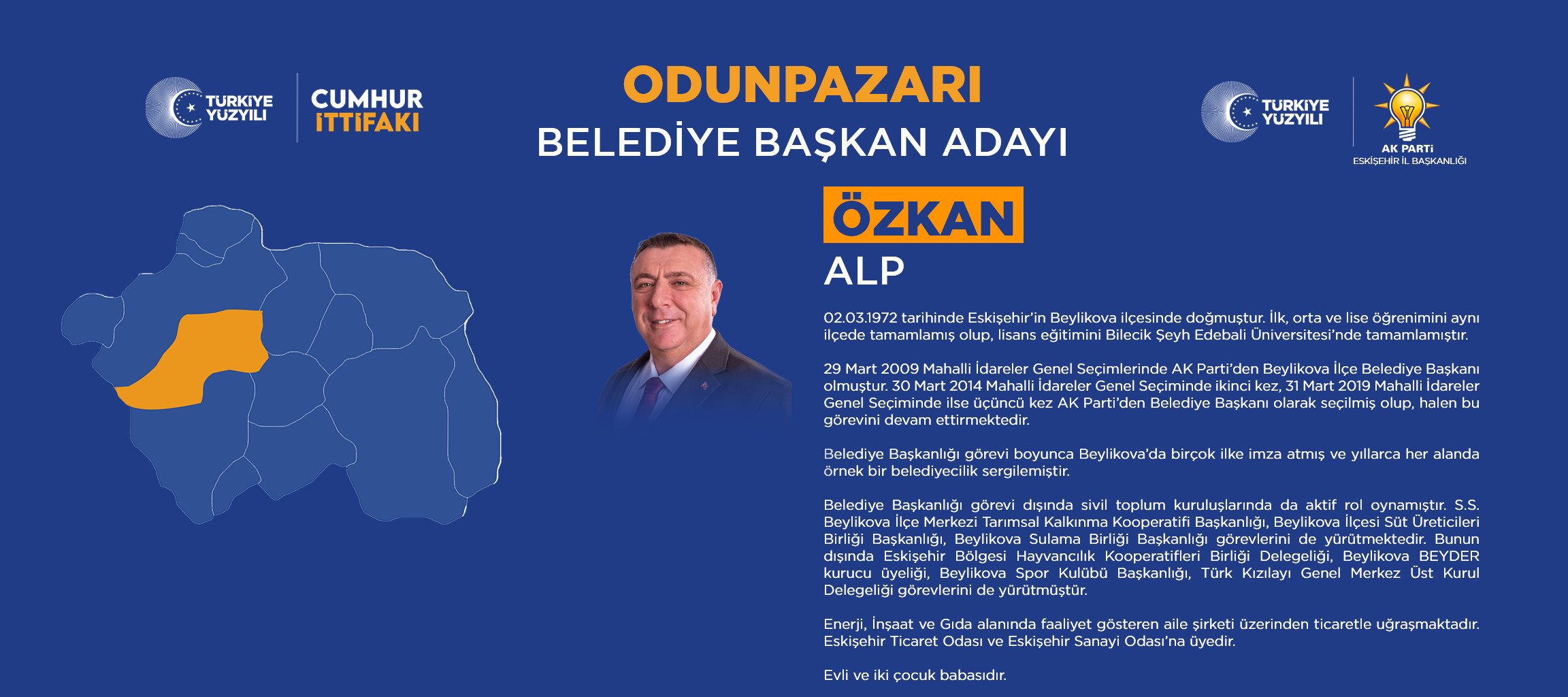 Dün Cumhurbaşkanı Recep Tayyip Erdoğan tarafından Cumhur İttifakı Odunpazarı Belediye Başkan Adayı olarak açıklanan Beylikova Belediye Başkanı Özkan Alp ilçenin çehresini değiştirip, ticaret, egitim ve tarımsal kalkınma anlamında gelişmesine öncülük etmiştir