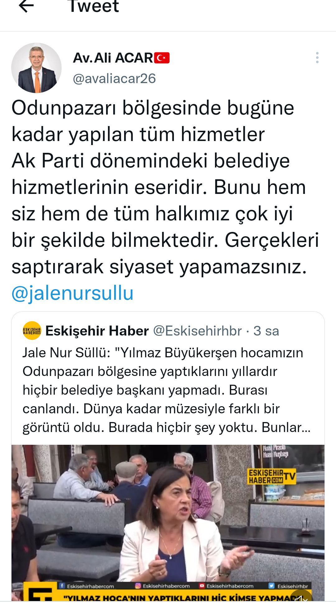 Adalet ve Kalkınma Partisi Odunpazarı ilçe Başkanı Ali Acar; Cumhuriyet Halk Partisi Eskişehir Milletvekili Jale Nur Süllu nün açıklamalarına tepki gösterdi.AK Parti ilçe Başkanı Acar;Odunpazarı bölgesinde bugüne kadar yapılan tüm hizmetler Ak Parti dönemindeki belediye hizmetlerinin eseridir. Bunu hem siz hem de tüm halkımız çok iyi bir şekilde bilmektedir. Gerçekleri saptırarak siyaset yapamazsınız ifadelerini kullandı. CHP Eskişehir Milletvekili JJale Nur Süllü bir röportajda "Yılmaz Büyükerşen hocamızın Odunpazarı bölgesine yaptıklarını yıllardır hiçbir belediye başkanı yapmadı. Burası canlandı. Dünya kadar müzesiyle farklı bir görüntü oldu. Burada hiçbir şey yoktu. Bunları hepimiz biliyoruz şeklinde konuşmuştu.AK Parti Odunpazarı ilçe Başkanı Ali Acar;2004-2014 yılları arasında AK Parti li Belediye Başkanı Burhan Sakallı nın hizmetlerine atıfta bulunarak Odunpazarı Bölgesine yapılan tüm hizmetler AK Parti döneminde yapılmıştır ifadelerini kullandı