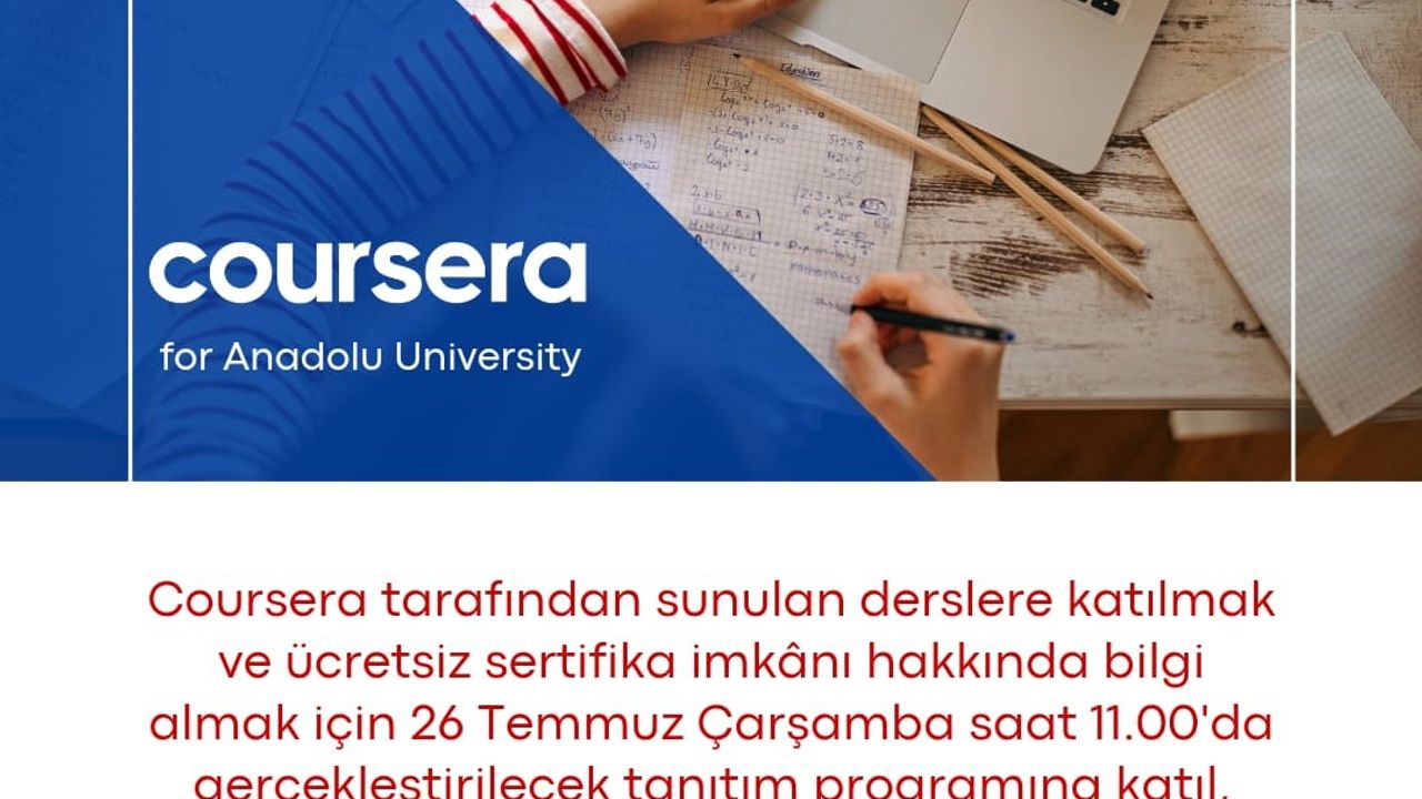 26 Temmuz Çarşamba günü saat 11.00'da gerçekleştirilecek tanıtım ve bilgilendirme toplantısından sonra Anadolu Üniversiteliler Coursera tarafından sunulan ve dünyanın her yerinde geçerli sertifikalara ücretsiz bir şekilde ulaşacak.