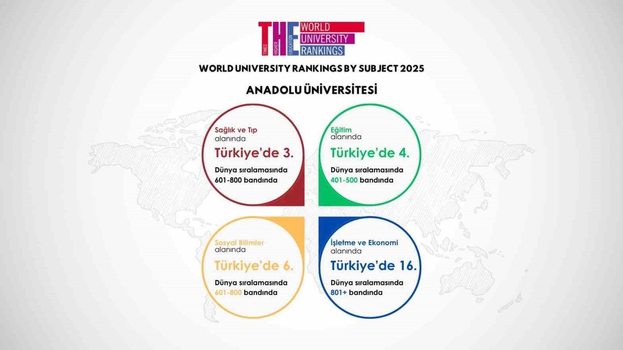 Dünyanın en bilinen uluslararası yükseköğretim derecelendirme kuruluşlarından biri olan Times Higher Education (THE) tarafından 2025 Dünya Üniversite Sıralamalarının ardından ‘Alan Bazlı Sıralamalar’ da açıklandı. Yayınlanan alan bazlı sıralamalara göre Anadolu Üniversitesi; Tıp ve Sağlık alanında Türkiye’de 3’ncü, dünyada 401 ila 500 bandında, Eğitim alanında Türkiye’de 4’ncü, dünyada 401 ila 500 bandında, Sosyal Bilimler alanında Türkiye’de 6’ncı, dünyada 601 ila 800 bandında, Ekonomi ve İşletme alanında ise Türkiye’de 16’ncı sırada kendine yer buldu.