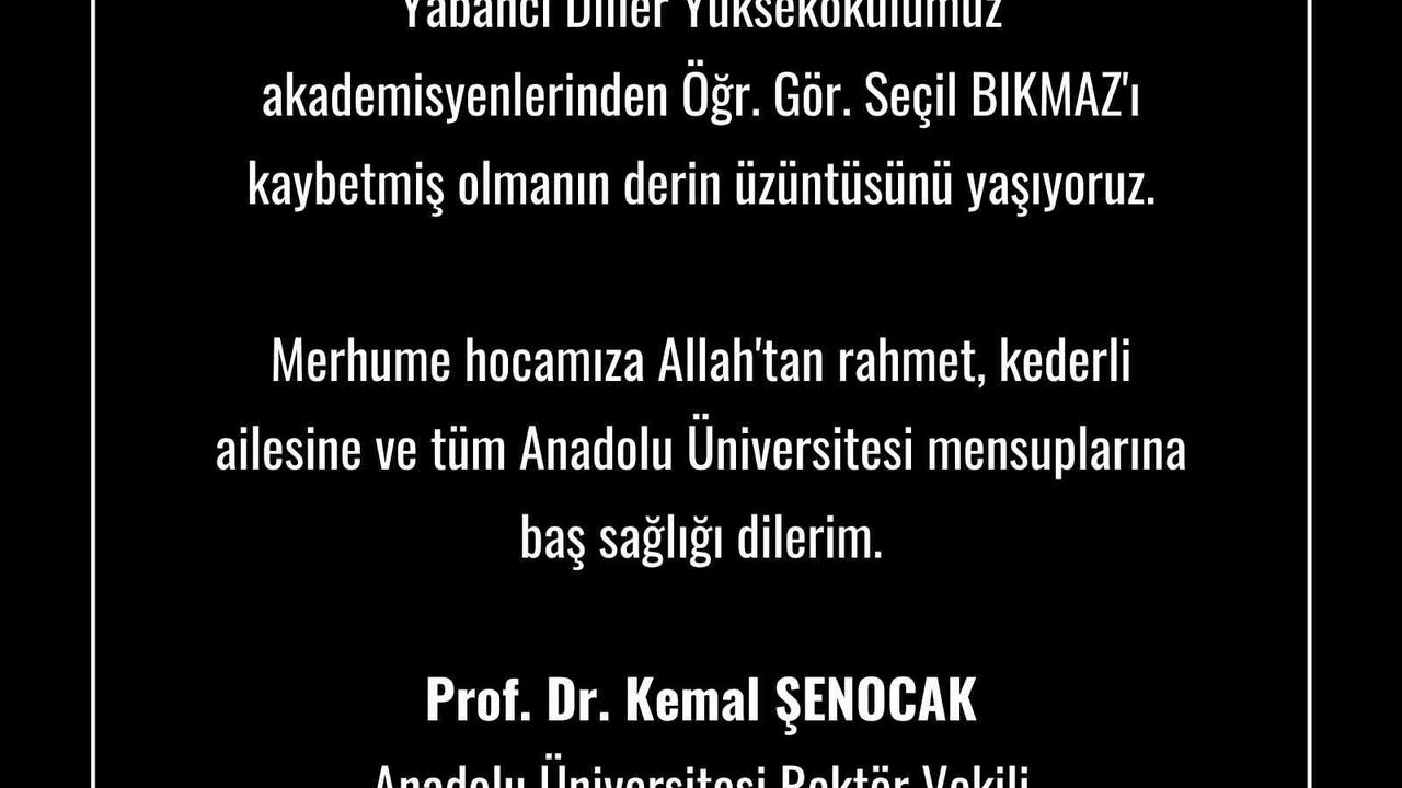 Eskişehir Anadolu Üniversitesi Rektör Vekili Prof. Dr. Kemal Şenocak, akademisyen Öğr. Gör. Seçil Bıkmaz’ın vefatı nedeniyle taziye mesajı yayımladı.