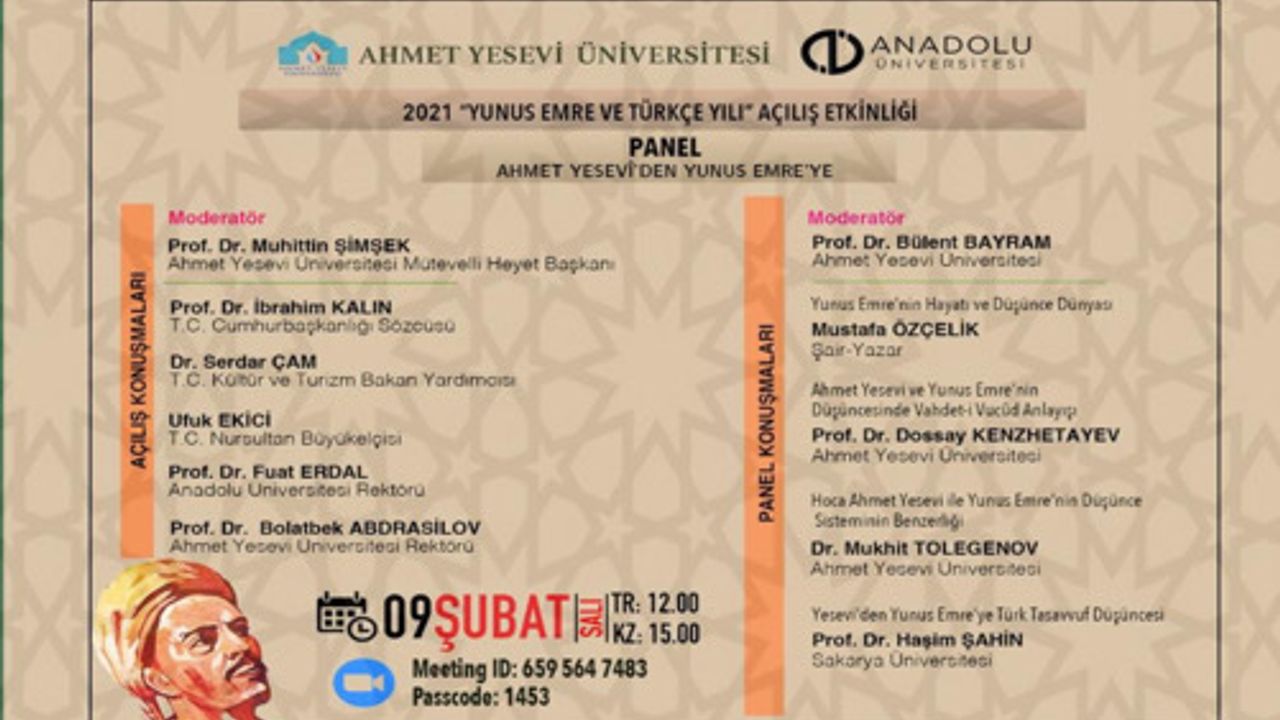 Panel konuşmalarını ise Ahmet Yesevi Üniversitesi’nden Prof. Dr. Bülent Bayram’ın moderatörlüğünde; Yunus Emre’nin Hayatı ve Düşünce Dünyası konusu ile Eskişehirli şair ve yazar Mustafa Özçelik, Ahmet Yesevi ve Yunus Emre’nin Düşüncesinde Vahdet-i Vücûd Anlayışı konusu ile Ahmet Yesevi Üniversitesi’nden Prof. Dr. Dossay Kenzhetayev, Hoca Ahmet Yesevi ile Yunus Emre’nin Düşünce Sisteminin Benzerliği konusunda Ahmet Yesevi Üniversitesi’nden Dr. Mukhit Tolegenov ve Yesevi’den Yunus’a Türk Tasavvuf Düşüncesi konusuyla Sakarya Üniversitesi’nden Prof. Dr. Haşim Şahin yapacaklar.