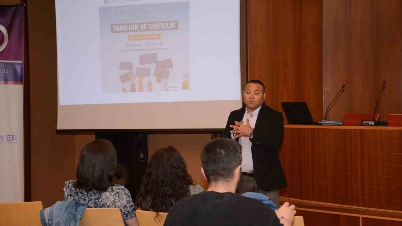 “AB’nin Bütünleşme Süreci İçerisinde Birliğin Kültür Politikası: Farklılık ve Çeşitlilik” etkinliğinde konuşmacı olarak yer alan Anadolu Üniversitesi İktisat Fakültesi öğretim üyesi Doç. Dr. Erhan Akdemir konuşmasında AB’nin bir araya gelme sürecinden bahsetti. Doç. Dr. Akdemir konuşmasına şöyle devam etti: “Avrupa Birliği’nde yirmi yedi farklı ülke, kültür, dil mevcut. Bu da yirmi yedi farklı düşünce demek. AB’de farklılıklara saygı duyan, ortak kültür mirası anlayışı var. Avrupa Birliği kültür farklılıklarını çeşitlilik olarak algılamaktadır. 2022 yılında başlayan ve 2025 yılında tamamlanması öngörülen ‘AB Jean Monnet Module’ kapsamında hazırladığımız projemiz ile AB bütünleşme sürecinde Birliğin kültür politikasını dersler, eğitim programları ve etkinlikler gibi çeşitli araçlarla siz değerli katılımcılarımız gibi öğrencilerimize ve insanlara aktarmaya, onları bilinçlendirme çalışıyoruz.”
