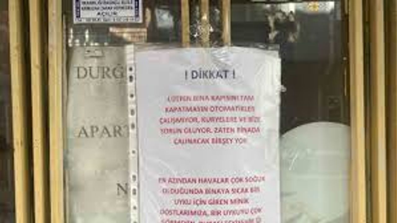 Hoşnudiye Mahallesi Müderris Sokak üzerinde bir apartman kapısına yazılan ilginç yazı dikkat çekti. Bina sakinleri tarafından kapıya yapıştırılan, “Lütfen bina kapısını tam kapatmayın, otomatikler çalışmıyor. Kuryelere ve bize sorun oluyor. Zaten binada çalınacak bir şey yok. En azından havalar çok soğuk olduğunda binaya sıcak bir uyku için giren minik dostlarımıza bir uykuya çok görmeyin. Burası Eskişehir. Ayrıca sevaptır” yazılı mesaj göze çarptı. Farkındalık içeren mesaj görenleri hem güldürdü hem de düşündürdü.