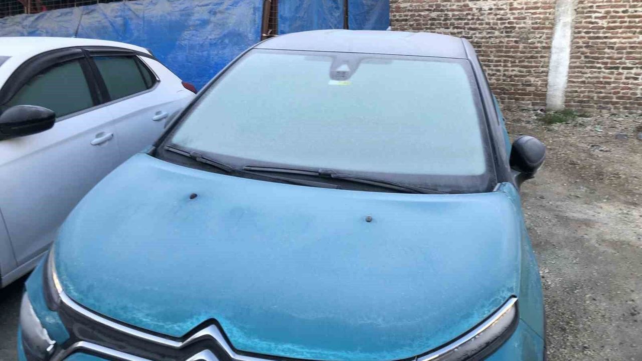 Eskişehir'de hava sıcaklıkların en düşük olduğu sabah saatlerinde arabaların camlarında buzlanma oluştu.