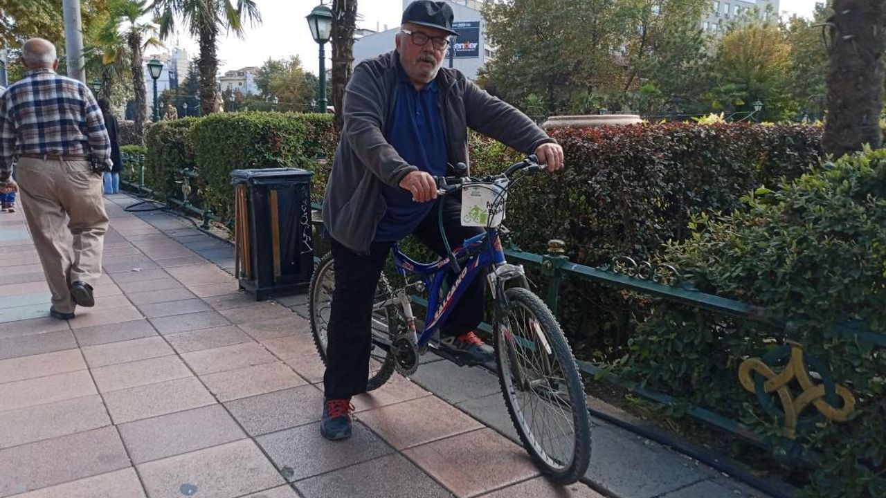 Eskişehir’de yaşayan İsmet Demir, bisikletinin önüne yapıştırdığı ‘Arabadan in, bisiklete’ bin sloganıyla dikkatleri topladı.