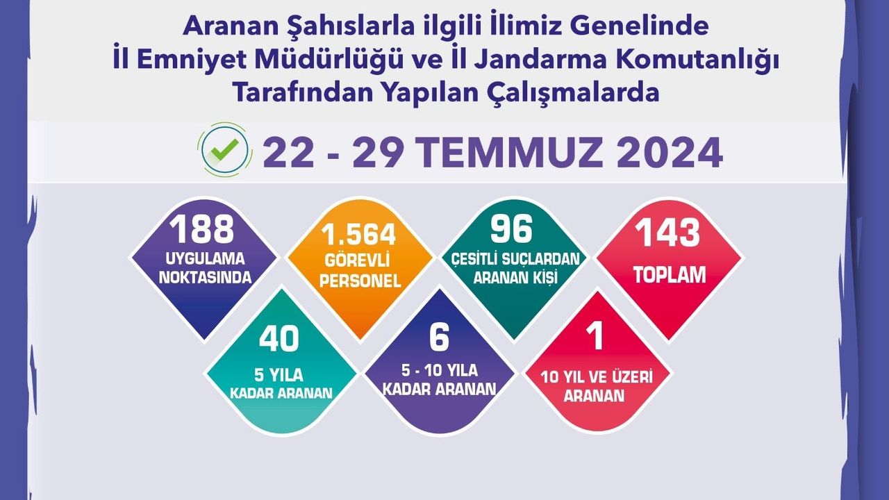 Çalışmalar sonucunda çeşitli suçlardan aranan 96 şüpheli, 5 yıla kadar aranan 40 şüpheli, 5 ila 10 yıla kadar aranan 6 şüpheli, 10 yıl ve üzeri aranan 1 şüpheli olmak üzere toplam 143 şüpheli yakalandı.