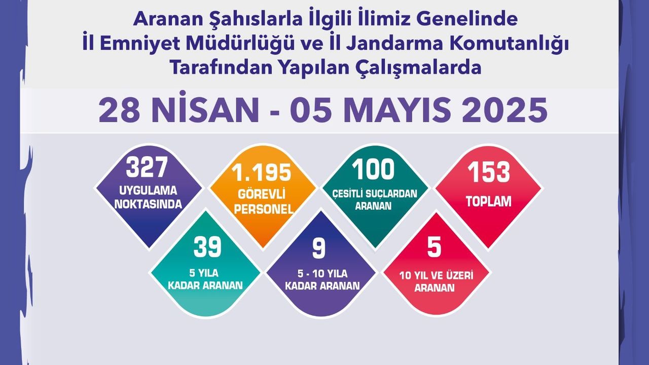 Ekiplerin çalışmaları sonucunda; çeşitli suçlardan aranan 100 şahıs, 5 yıla kadar aranan 39 şahıs, 5 ila 10 yıla kadar aranan 9 şahıs ile 10 yıl ve üzeri aranan 5 şahıs olmak üzere toplam 153 şahıs yakalandı.