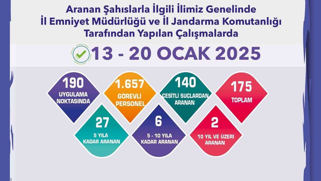 Edinilen bilgilere göre, Eskişehir İl Emniyet Müdürlüğü ve İl Jandarma Komutanlığı ekiplerince aranan şahıslarla ilgili çalışma yapıldı. İl genelinde 13-20 Ocak 2025 tarihleri arasında gerçekleştirilen çalışmalarda, 190 uygulama noktasında bin 657 personel görevlendirildi. Ekiplerin çalışmaları sonucunda; çeşitli suçlardan aranan 140 şahıs, 5 yıla kadar aranan 27 şahıs, 5 ila 10 yıla kadar aranan 6 şahıs, 10 yıl ve üzeri aranan 2 şahıs olmak üzere toplam 175 şahsın yakalandığı öğrenildi.