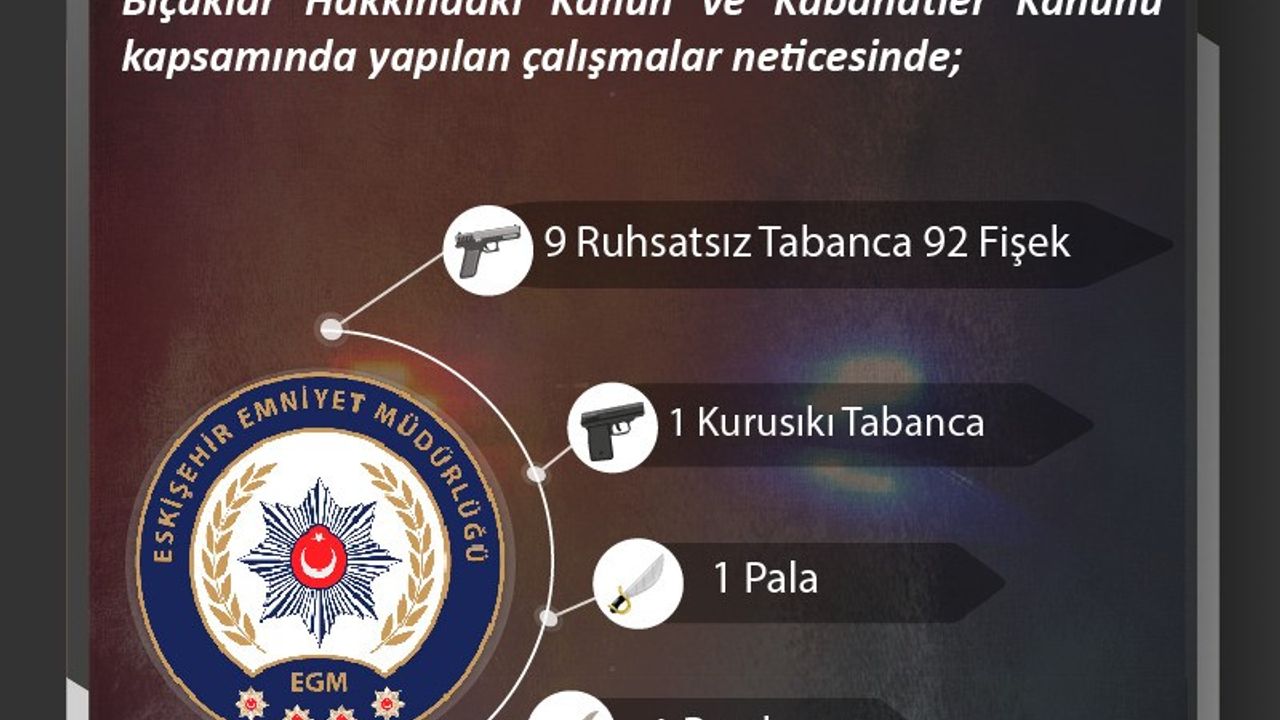 Edinilen bilgilere göre, Eskişehir İl Emniyet Müdürlüğü'ne bağlı ekiplerce halkın huzur ve güvenliğini sağlamak amacıyla 19-25 Aralık 2024 tarihlerinde çalışma yapıldı. 'Ateşli Silah ve Bıçaklar Hakkındaki Kanun' ile 'Kabahatler Kanunu' çerçevesinde gerçekleştirilen çalışmalar kapsamında; 9 ruhsatsız tabanca ve 92 fişek, 1 kurusıkı tabanca, 1 pala ve 1 bıçak ele geçirildi.