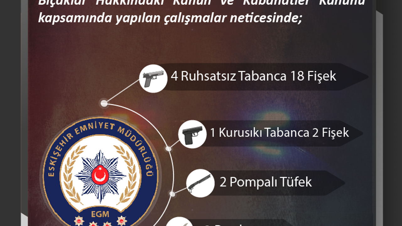 Edinilen bilgilere göre, Eskişehir İl Emniyet Müdürlüğü'ne bağlı ekiplerce halkın huzur ve güvenliğini sağlamak amacıyla 12-19 Aralık 2024 tarihlerinde çalışma yapıldı. 'Ateşli Silah ve Bıçaklar Hakkındaki Kanun' ile 'Kabahatler Kanunu' çerçevesinde gerçekleştirilen çalışmada; 4 ruhsatsız tabanca, 1 kurusıkı tabanca, 2 pompalı tüfek, 20 fişek ve 3 bıçak ele geçirildi. Ayrıca ekiplerce 9 olaya müdahale edilirken, 9 şüpheliye işlem uygulandığı öğrenildi.