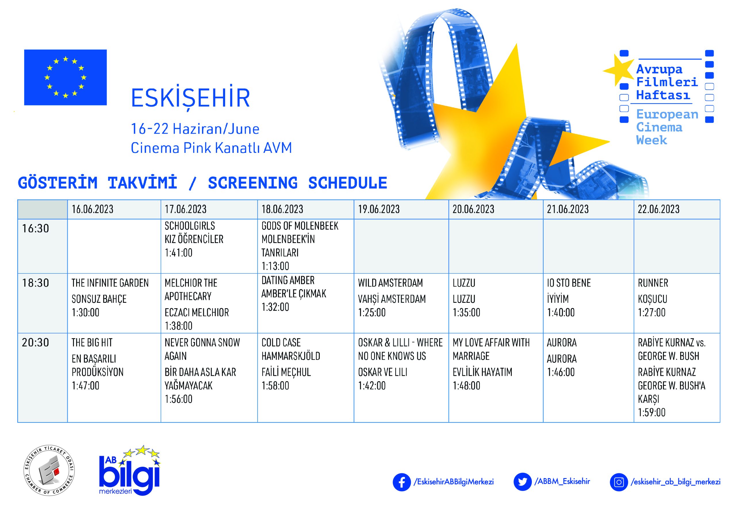 Avrupa sinemasının farklı kültürleri ve hikâyeleri konu aldığı filmlerin gösterimleri 16 Haziran Cuma Günü; Bulgaristan’dan “Sonsuz Bahçe” ve Fransa’dan “En Başarılı Prodüksiyon” ile başlayacak. 17 Haziran Cumartesi günü; İspanya’dan “Kız Öğrenciler”, Estonya’dan “Eczacı Melchior” ve Polonya’dan “Bir Daha Asla Kar Yağmayacak” gösterime sunulacak. 18 Haziran Pazar günü; Belçika’dan “Molenbeek’in Tanrıları”, İrlanda’dan “Amber’le Çıkmak”, İsveç’ten “Faili Meçhul” gösterime sunulurken, 19 Haziran Pazartesi günü; Hollanda’dan “Vahşi Amsterdam” ve Avusturya’dan “Oskar ve Lilli” beyaz perdeye yansıtılacak. 20 Haziran Salı günü; Malta’dan “Luzzu” Letonya’dan “Evlilik Hayatım” 21 Haziran Çarşamba günü; İtalya’dan “İyiyim” ve Finlandiya’dan “Aurora” isimli film gösterime sunulacak. 22 Haziran Perşembe; Litvanya’dan “Koşucu” ve Almanya’dan “Rabiye Kurnaz George W. Bush’a Karşı” filmi ile Avrupa Filmleri Haftası son bulacak. Avrupa Filmleri Haftası’nın Eskişehir gösterim planı ve filmler gösterime girecek