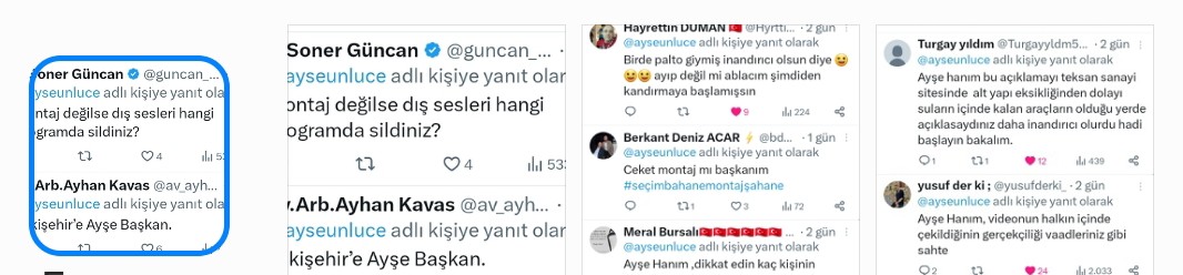 Mertcan Kunduz:Sayın Ayşen hanım, keşke montaj değilde gerçekten sokağa çıkıp verseydiniz bu röportajı Üstünüz belki toz olurdu ama halka karışmış olurdunuz… Fatih Çelik:insan şu şekilde montaj video ile ilk mesajını veriyorsa... makyaj belediyeciliği yapmalarına şaşırmamak lazım...10 yıldır Büyükerşen ile birlikte yatıyorsunuz belediyede... Eskişehir e hiçbir artınız olmadı... Ahmet Şerifoglu:Bari videoyu stüdyoda değilde sokakta çekseydiniz Fatih Altıntaş: ilk olarak daha kaliteli montaj yapan birini bulun Öte yandan bugün Şehit cenazesine katılan Tunahan Öztürk isimli vatandaş ise ; CHP Eskişehir Büyükşehir Belediye Başkan Adayı Ayşe Ünlüce, şehidimizin caneze töreninden "durulacak gibi değil" diyerek, tören daha başlamadan ayrıldı. Yanımdan geçerken kurduğu bu cümle, sırf görüntü olsun diye göstermelik iş yaptıklarını bir kez daha hissettirdi. İfadelerini kullandı