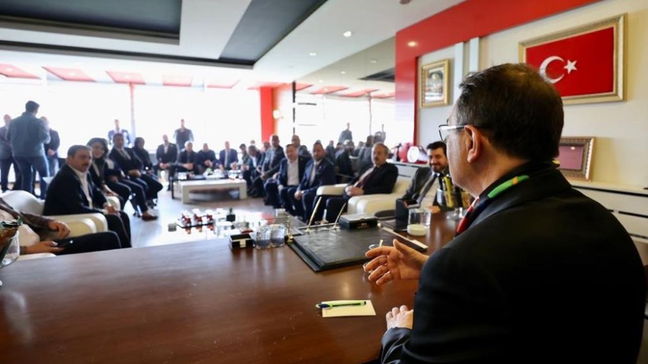 Kulüp Başkanı Koca, yöneticilerle sohbet eden Bakan Dönmez’e kırmızı siyahlıların forma ve atkısını hediye etti, rozet taktı.