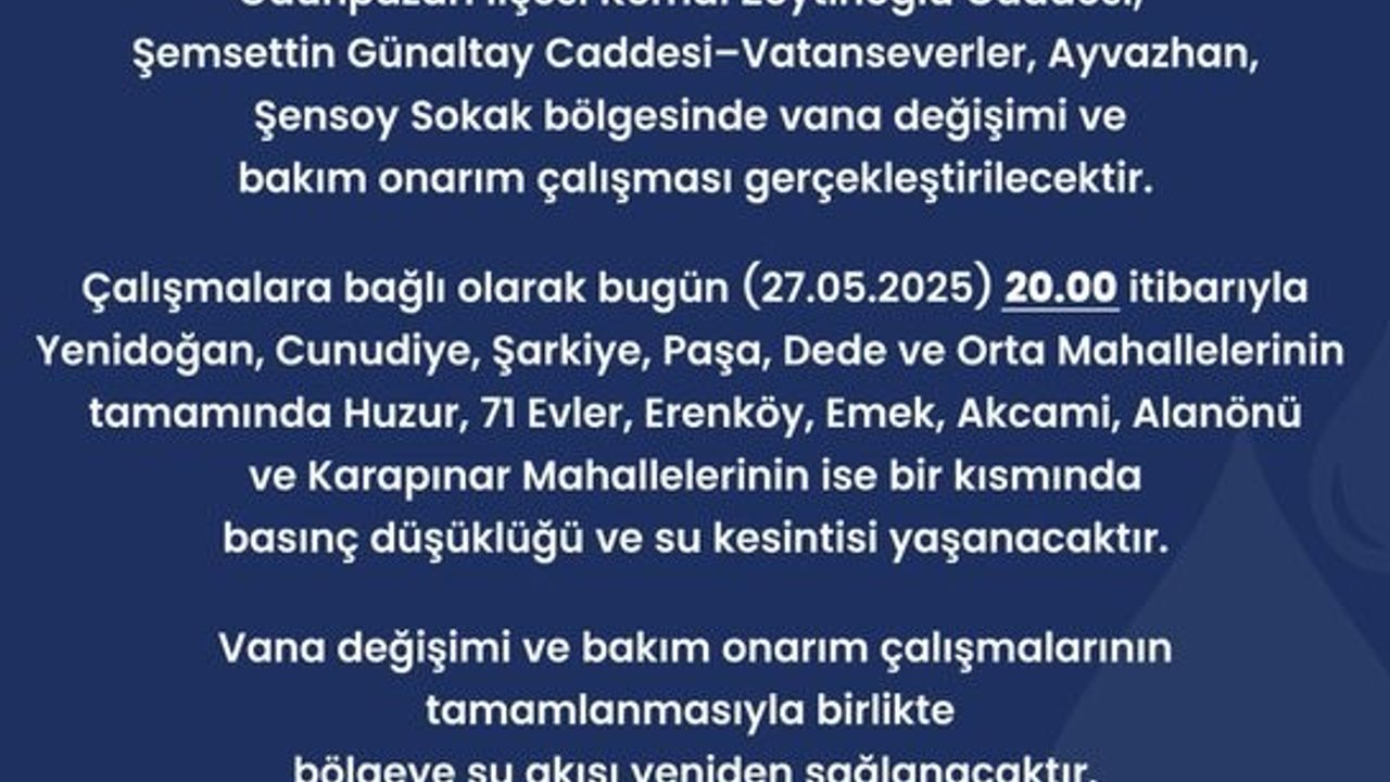 Konuyla ilgili yapılan açıklamada, "Odunpazarı İlçesi Kemal Zeytinoğlu Caddesi, Şemsettin Günaltay Caddesi-Vatanseverler, Ayvazhan, Şensoy Sokak bölgesinde vana değişimi ve bakım onarım çalışması gerçekleştirilecektir. Çalışmalara bağlı olarak bugün (27 Mayıs 2025) 20.00 itibarıyla Yenidoğan, Cunudiye, Şarkiye, Paşa, Dede ve Orta Mahallelerinin tamamında; Huzur, 71 Evler, Erenköy, Emek, Akcami, Alanönü ve Karapınar Mahallelerinin ise bir kısmında basınç düşüklüğü ve su kesintisi yaşanacaktır. Vana değişimi ve bakım onarım çalışmalarının tamamlanmasıyla birlikte bölgeye su akışı yeniden sağlanacaktır. Mahalle sakinlerine önemle duyurulur" ifadeleri yer aldı.