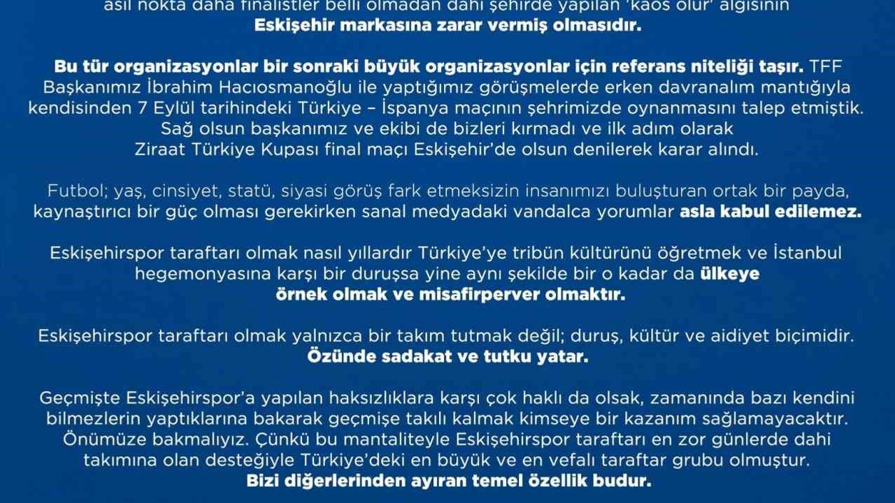 Başkan Albayrak, şehrin ve takımın geleceği için çaba göstermeye devam edeceğini vurgulayarak,"Geçtiğimiz gün, Ziraat Türkiye Kupası finalinin şehrimizde olacağı duyurulmasının ardından konu epeyce gündem oldu. Haddini aşmayan eleştiriler başımızın tacı. Ancak, haddini aşan bazı yorum yapanlarla tek merkezden yönetilerek olayı farklı yerlere çabasında olan sözde danışmanlar ve ekürileri sizler Eskişehir’e ihanet eden toksik tiplersiniz... Eskişehirspor taraftarı bir vatandaş olarak, Eskişehirspor’umuzun ve şehrimizin geleceği için elimden geleni her fırsatta yapma çabası içerisindeyim, olmaya da devam edeceğim. Bizi üzen asıl nokta daha finalistler belli olmadan dahi şehirde yapılan ’kaos olur’ algısının Eskişehir markasına zarar vermiş olmasıdır" dedi.